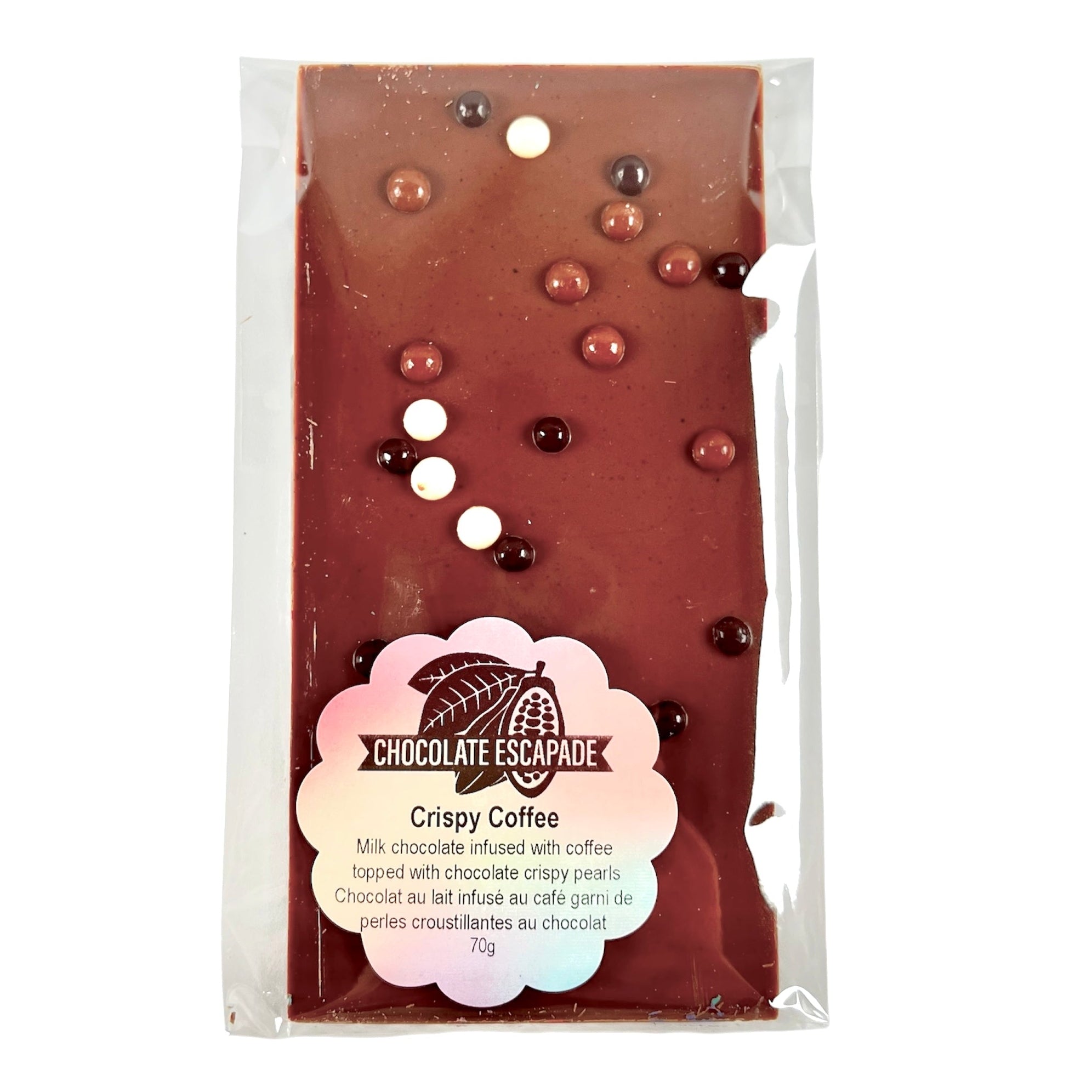 This tablet is crafted with our custom blend of Valrhona chocolate and the amazing coffee beans of local roaster, Alternate Route. Finished with delicious chocolate crisp pearls.