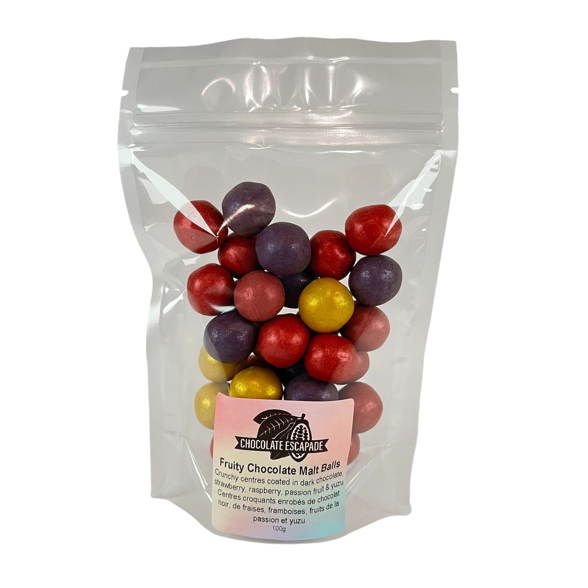 Snack on a truly unique treat! Our crunchy malt balls are coated in two layers of chocolate. The inside layer is a 55% dark chocolate. The outside layer is comprised of fruit couverture that is made with 100% real fruit. No artificial flavours here!